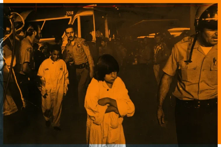 Officers escort the children off a Greyhound bus upon their return to Chowchilla at 4 am in July 1976. Afterward, the kids experienced trauma; some are still afraid of the dark. Rick Meyer/Los Angeles Times via Getty Images