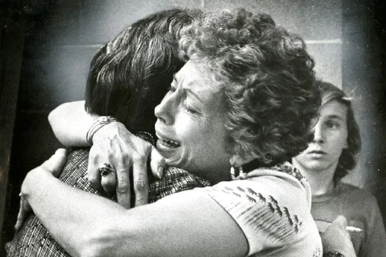 Relatives of the kidnapped and missing children, keeping a vigil at the Chowchilla police station, hug and weep upon learning the children had just been found safe. Sacramento Bee File Photo via Getty